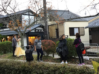 早朝に羽織袴の新郎さんと白無垢姿の美しい花嫁さんがお散歩